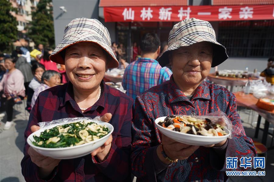 11月2日,南京仙林街道仙林新村社區(qū)居民錢序仁(左)和呂桂英帶上自己做的菜前來赴宴。 新華社記者 季春鵬 攝