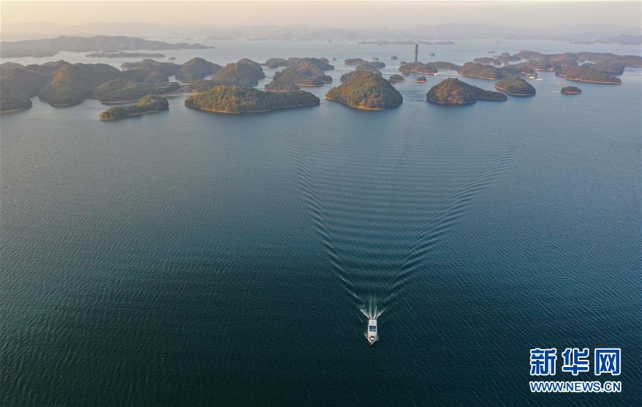 11月9日無(wú)人機(jī)拍攝的廬山西海。 當(dāng)日,落日余暉下的江西廬山西海山青水藍(lán),美不勝收。 新華社記者 周密 攝