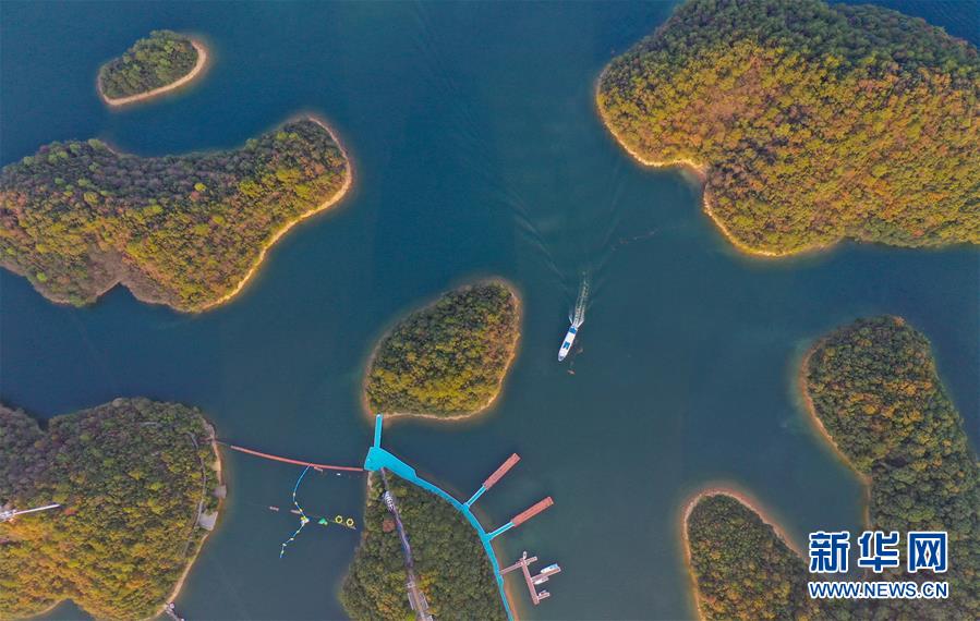 11月9日無人機(jī)拍攝的廬山西海。 當(dāng)日,落日余暉下的江西廬山西海山青水藍(lán),美不勝收。 新華社記者 周密 攝