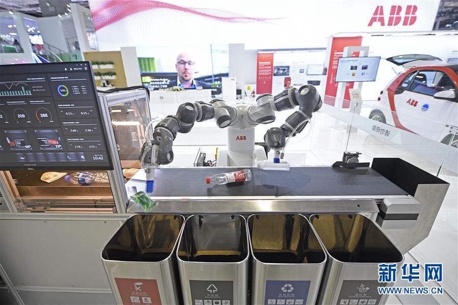 第二屆進(jìn)博會瑞士ABB集團(tuán)展出的人機(jī)協(xié)作雙臂機(jī)器人YuMi在進(jìn)行垃圾分類演示(11月5日攝)。新華社記者王鵬攝