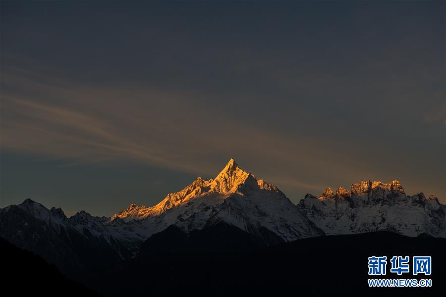 日出時(shí)分,陽(yáng)光照射在梅里雪山緬茨姆峰上(11月8日攝)。 初冬時(shí)節(jié),位于云南省西北部的迪慶藏族自治州境內(nèi)的梅里雪山、普達(dá)措、納帕海、白水臺(tái)等景色迷人。 新華社記者 胡超 攝