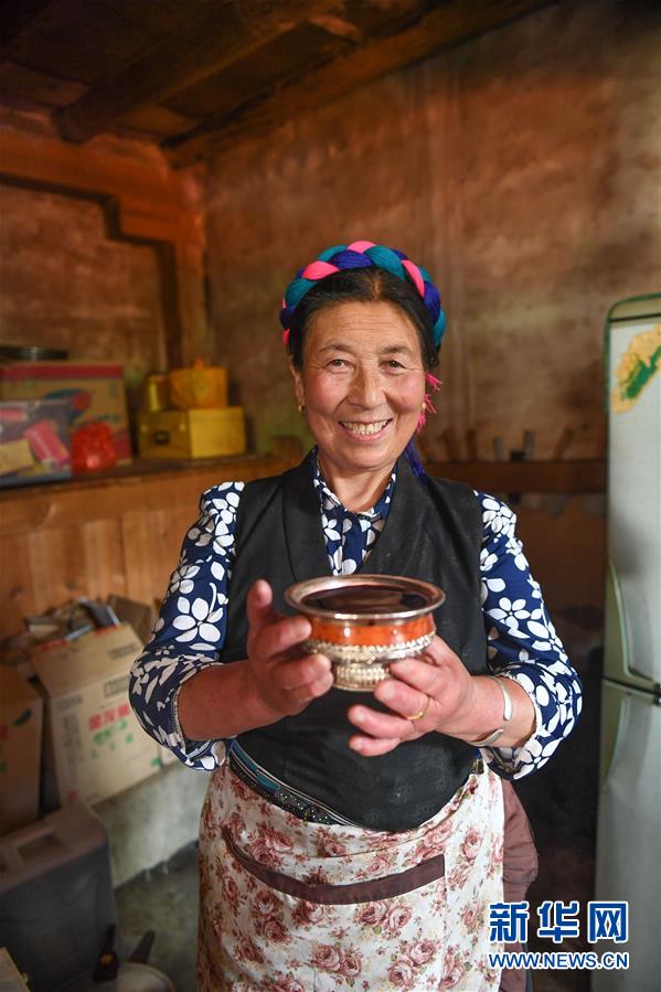 西藏昌都市芒康縣納西民族鄉(xiāng)村民在展示自家釀造的葡萄酒(6月3日攝)。新華社記者晉美多吉攝