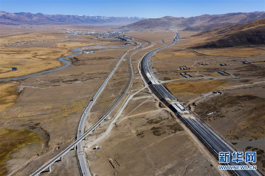西藏當雄縣城附近,青藏鐵路、國道和即將完工的公路并行(10月28日攝)。新華社記者江宏景攝
