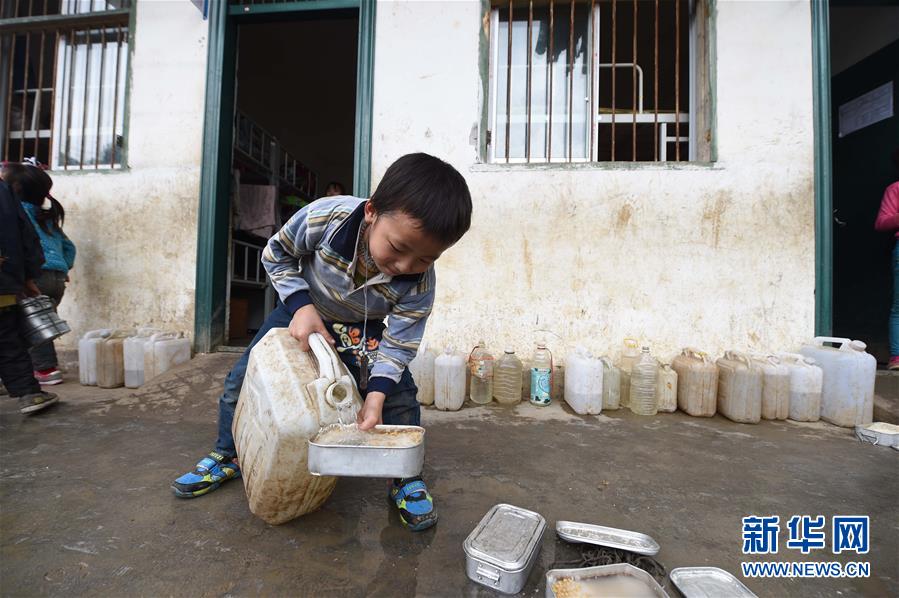 在廣西大化瑤族自治縣板升鄉(xiāng)八好小學(xué),一名學(xué)生喝水桶里的雨水(2014年11月24日攝)。八好小學(xué)有400多名學(xué)生,曾僅有一個(gè)不足100立方米的水柜,用于收集儲(chǔ)存樓頂?shù)挠晁?,學(xué)生需定期定量用水。遇到長(zhǎng)時(shí)間不下雨,學(xué)校需要到鄉(xiāng)政府所在地運(yùn)水。如今,學(xué)校修建了5個(gè)大水柜,并從兩公里外引泉水到校園,飲水難問題得到解決。新華社記者黃孝邦攝