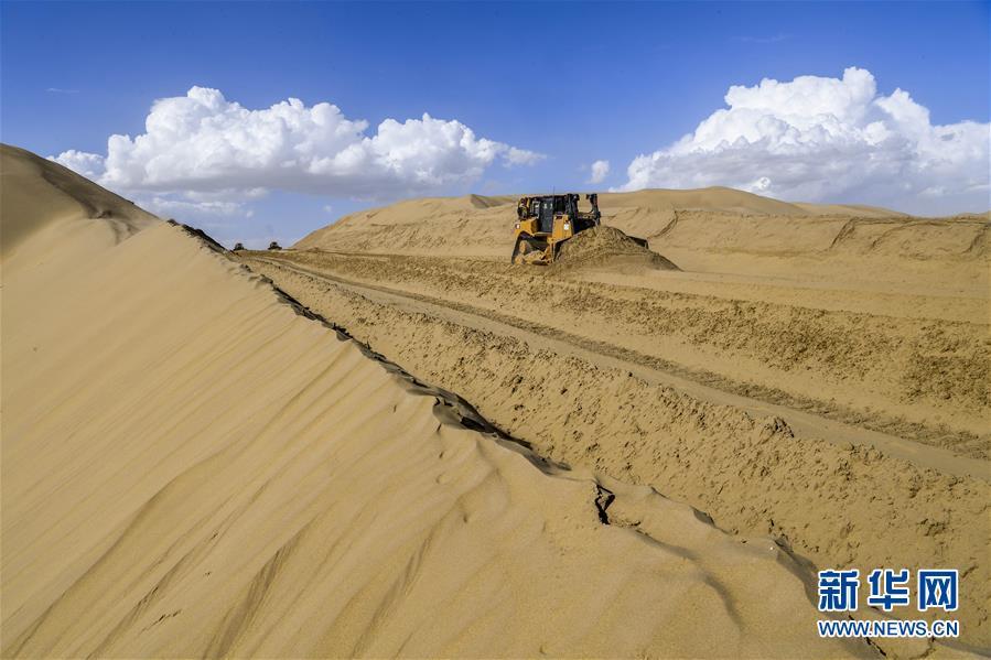 這是建設中的新疆且末縣至尉犁縣的沙漠公路(7月5日攝)。新華社記者胡虎虎攝