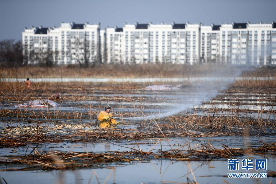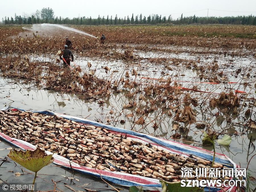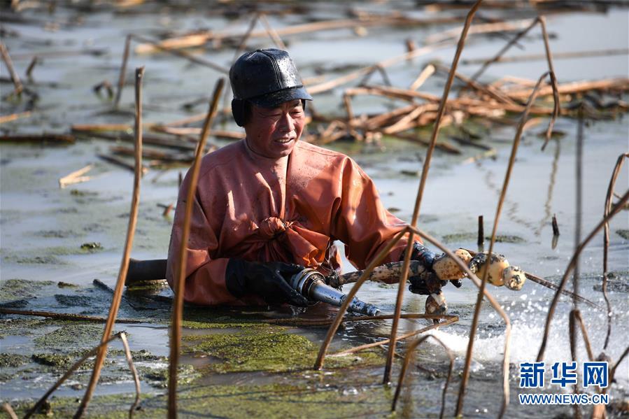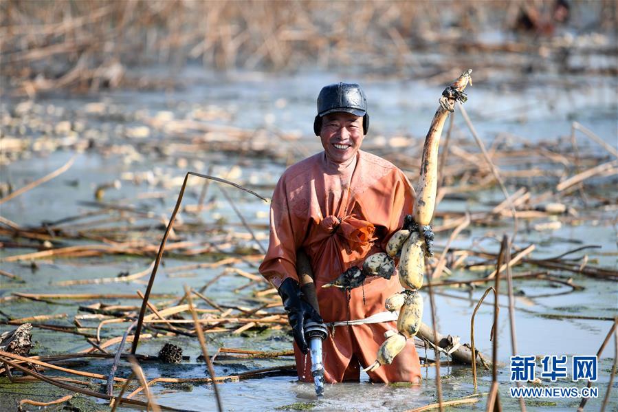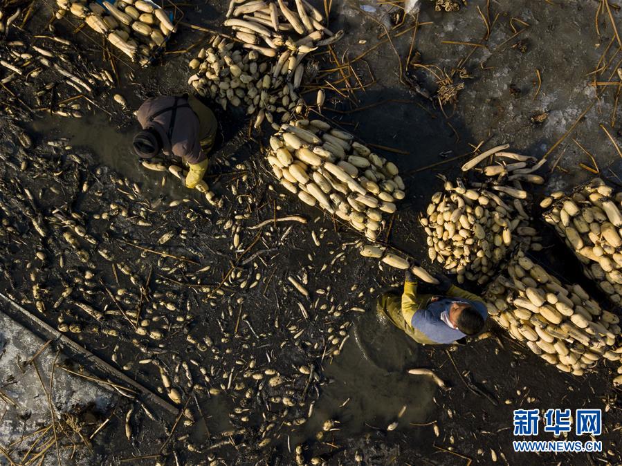 11月18日,工人在采收蓮藕。初冬時節(jié),河北省唐山市曹妃甸蓮藕豐收,工人們在結冰之前忙著采收蓮藕。新華社記者楊世堯攝