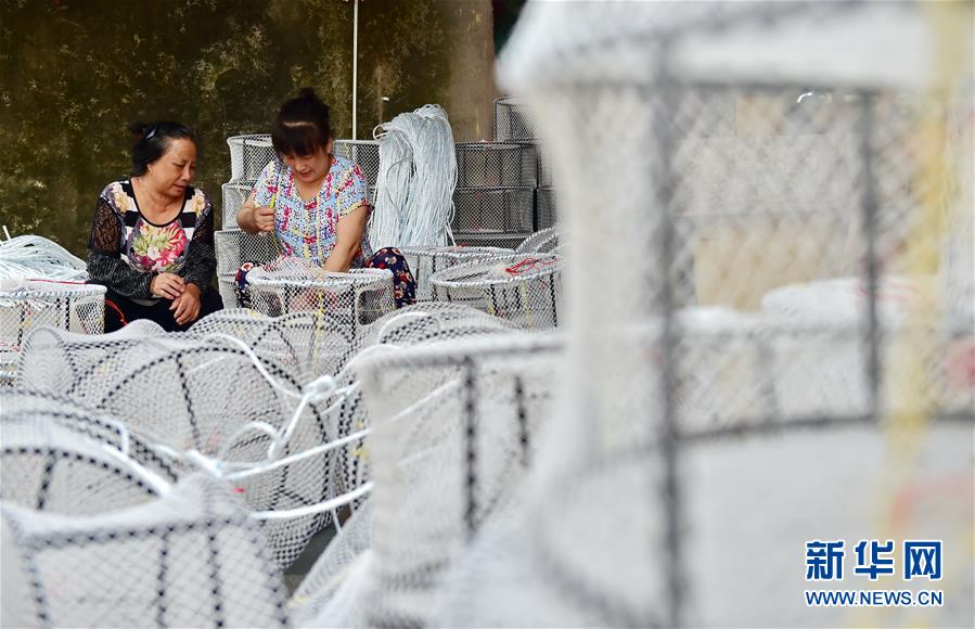 8月22日,福安市下岐村村民在織漁網(wǎng)。新華社記者林善傳攝