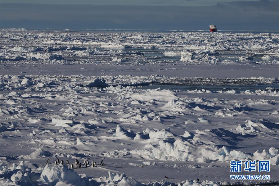 從“雪龍2”號上拍攝的企鵝群和“雪龍”號(11月19日攝)。新華社記者劉詩平攝
