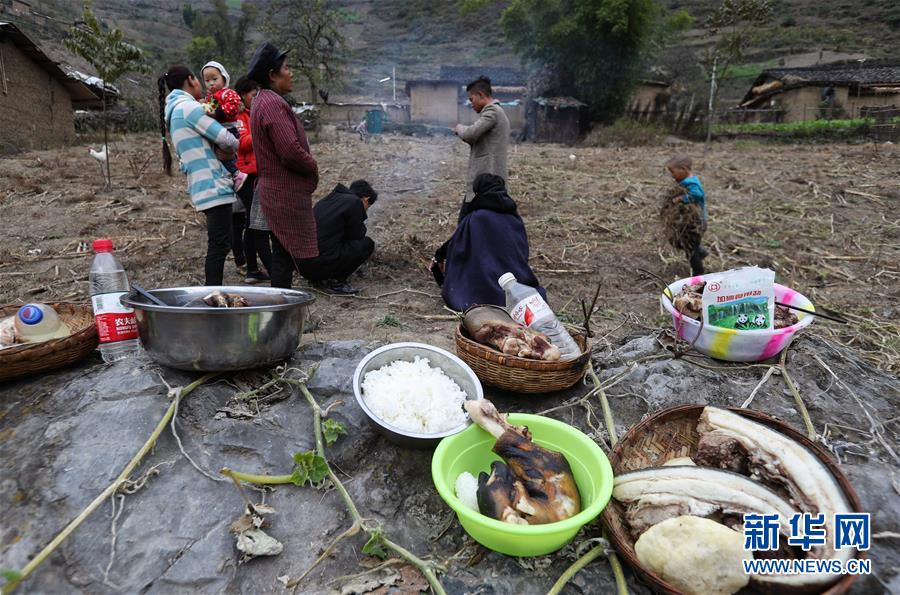 11月24日,在昭覺縣支爾莫鄉(xiāng)阿土列爾村,當(dāng)?shù)鼐用駵蕚涫焓?、酒等食物祭祖,并相互贈送?1月20日至26日是四川省涼山彝族自治州大小涼山彝族群眾傳統(tǒng)節(jié)日——彝族年,懸崖上的阿土列爾村的彝族群眾殺年豬、祭祀和走親拜年,慶祝一年一度的彝族年。阿土列爾村是“懸崖村”,位于四川省涼山彝族自治州昭覺縣支爾莫鄉(xiāng),坐落在海拔1400-1600米山坳中,這里居住著60多戶彝族群眾,村民走出大山,需要攀爬懸崖。新華社記者江宏景攝