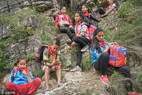 5月14日是家長(zhǎng)接孩子的日子,清晨6點(diǎn)多,30多歲的陳古吉帶著背包繩和另外兩個(gè)家長(zhǎng)一起下山接孩子。村里身手敏捷的年輕人,下山通常需要1小時(shí),上山大約90分鐘,對(duì)于外來(lái)的人,通常是這個(gè)時(shí)間的兩倍。圖片來(lái)源:視覺(jué)中國(guó)