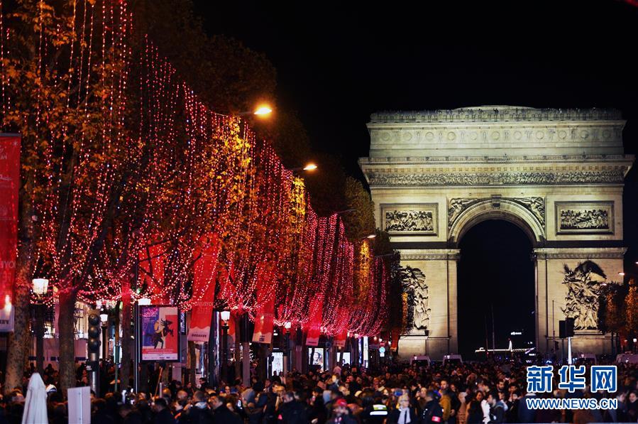 11月24日,在法國巴黎,人們在香榭麗舍大街上參加點(diǎn)燈儀式。當(dāng)日,法國巴黎香榭麗舍大街點(diǎn)亮彩燈迎圣誕。從即日起至1月8日,整條香榭麗舍大街都將被喜慶的節(jié)日燈飾點(diǎn)亮。新華社記者高靜攝