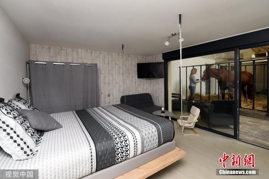 當(dāng)?shù)貢r間2019年11月25日,法國桑圖瓦地區(qū)弗賴斯內(nèi),一家特別的“酒店”開張,入住者可以透過玻璃清楚的看到馬廄里的馬,還可以跟馬親密接觸。圖片來源:視覺中國