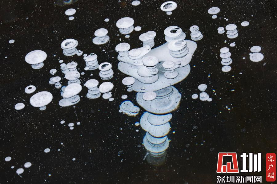 地處漠河市觀音山景區(qū)的蓮花湖湖面已經(jīng)完全封凍,冰層最厚的地方已經(jīng)超過60厘米,透過晶瑩剔透的冰面可以看到一串串潔白的氣泡分布在冰層之中,形成一組組惟妙惟肖的“冰泡”奇觀。