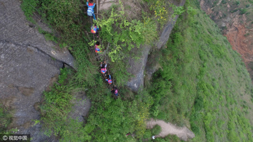 4月27日,阿土勒爾村的一個(gè)村民摔下了懸崖,村子里的大人對(duì)在山下讀書的孩子更加擔(dān)心起來(lái)。阿土勒爾村有15個(gè)6至15歲的孩子在山腳下的勒爾小學(xué)上學(xué),平時(shí)住校,每月月中和月底的周末才回家。每次上下山,家長(zhǎng)們都會(huì)輪流接送。圖片來(lái)源:視覺(jué)中國(guó)
