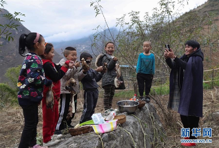 11月24日,在昭覺(jué)縣支爾莫鄉(xiāng)阿土列爾村,村民阿牛用手機(jī)拍攝孩子們向大家拜年的視頻。新華社記者江宏景攝