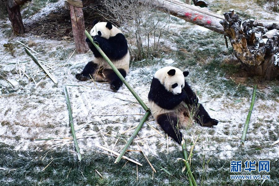 11月29日,在西寧熊貓館內(nèi),兩只大熊貓?jiān)诔灾褡印?當(dāng)日,青海省西寧市迎來降雪,西寧熊貓館四只“萌寵”大熊貓?jiān)谘┨炖锵硎苤灾褡拥臉啡ぁ?jù)了解,大熊貓生活的適宜溫度在26攝氏度至零下5攝氏度之間,冬季氣溫低于零下5攝氏度時(shí),場館會啟用保暖設(shè)施。 新華社記者 吳剛 攝