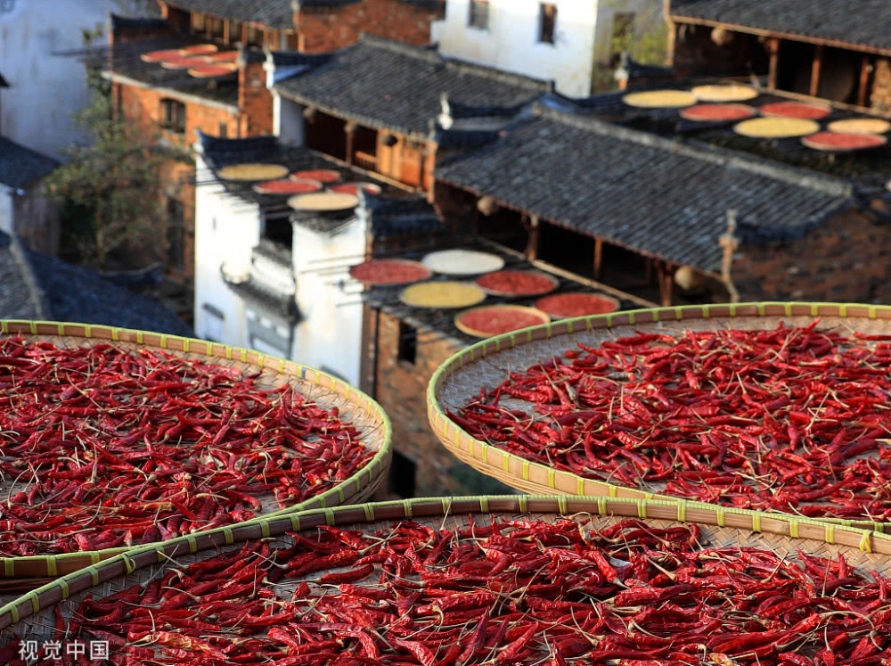 進(jìn)入深秋,江西省婺源縣篁嶺古村“曬秋人家”秋色繽紛。