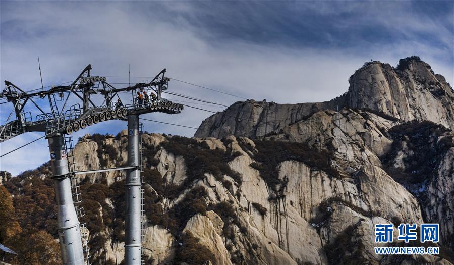 華山太華索道維修人員在進(jìn)行索道支架橫擔(dān)檢測(12月5日無人機拍攝)。新華社記者陶明攝