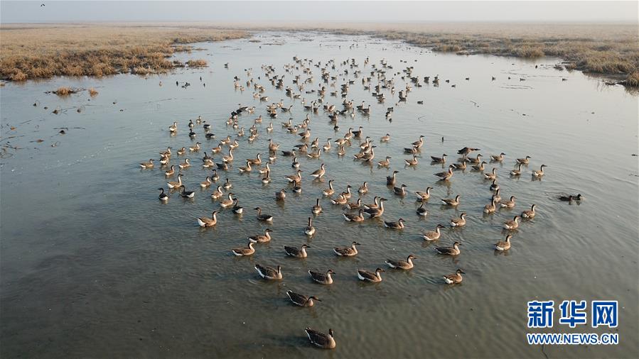 12月7日,一群候鳥在升金湖停留(無人機拍攝)。新華社記者張端攝