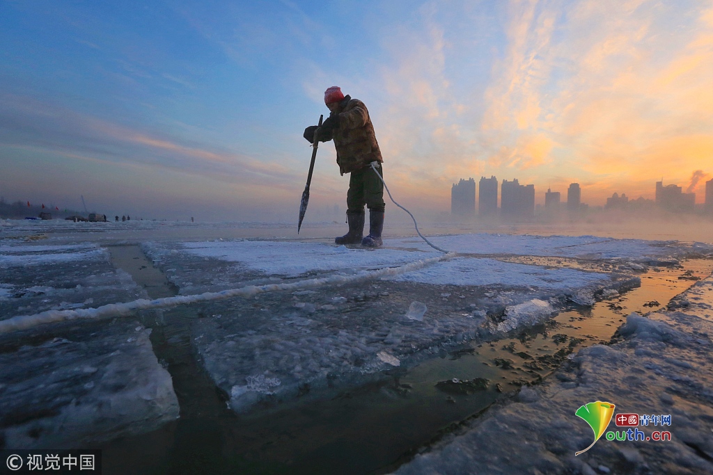 中國青年網(wǎng)2018年12月13日訊2018年12月11日,黑龍江省哈爾濱市,松花江上,采冰人在漫天霞光中破冰、采冰,金色光芒在水霧上升騰繚繞,給勞動的場面增添了詩意。