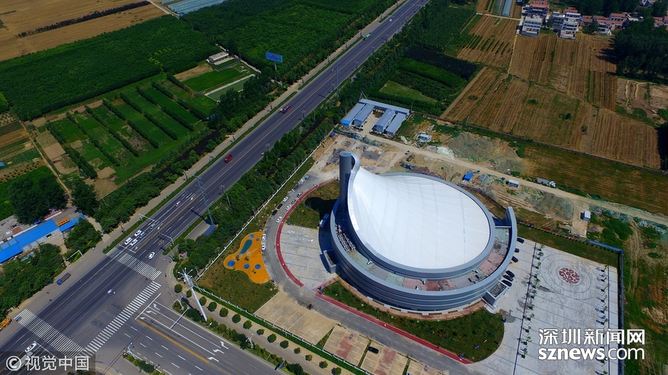 2018年6月13日,航拍河南淮陽(yáng)一座即將竣工落成的體育場(chǎng)館建筑,市民稱酷似一個(gè)石磨盤。