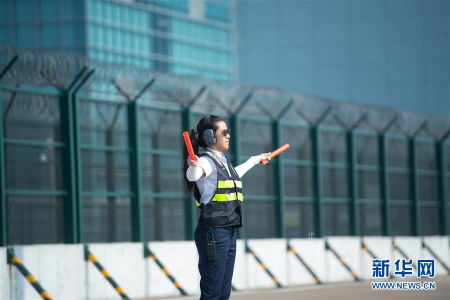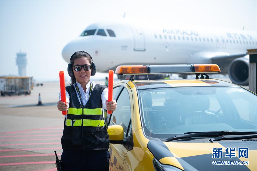 11月25日,澳門國際機(jī)場(chǎng)營運(yùn)員鄧祺君在機(jī)場(chǎng)指揮飛機(jī)停泊,她已經(jīng)工作了3年。 新華社記者 張金加 攝