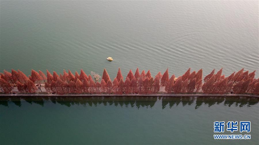 12月10日,一只小船在湖南烈士公園年嘉湖湖面行駛時(shí)經(jīng)過(guò)游道(無(wú)人機(jī)拍攝)。新華社記者陳澤國(guó)攝