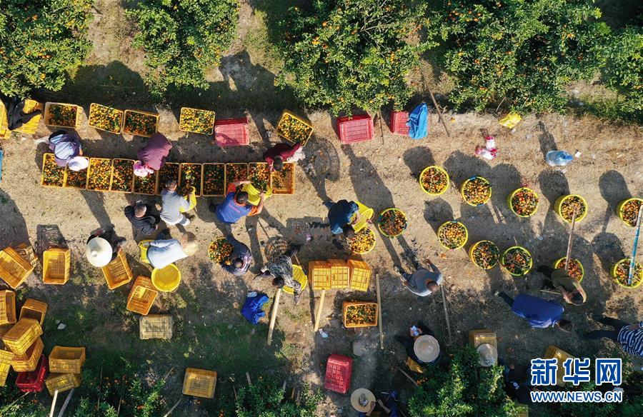 12月11日,廣西柳州市鹿寨縣四排鎮(zhèn)四排村村民在果園里將砂糖橘裝箱(無(wú)人機(jī)拍攝)。