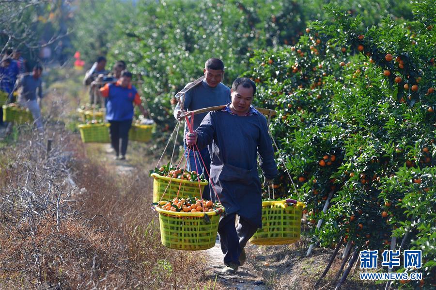 12月11日,廣西柳州市鹿寨縣四排鎮(zhèn)四排村村民在果園里挑運(yùn)砂糖橘。新華社記者 黃孝邦 攝