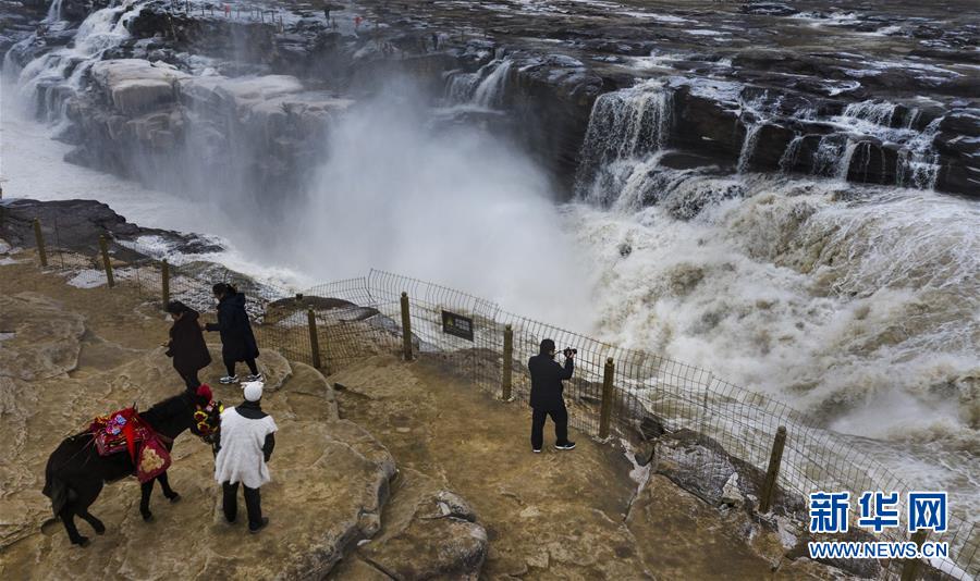 12月14日,游人在壺口瀑布景區(qū)游玩(無(wú)人機(jī)拍攝)。 新華社記者 陶明 攝