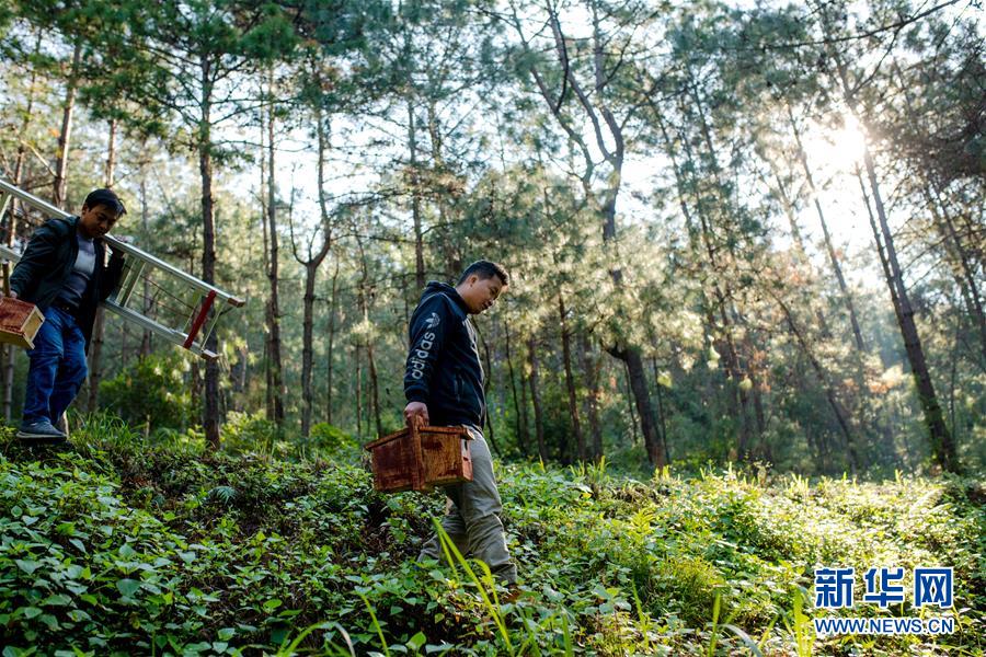 羅康(右)和同事準(zhǔn)備在哀牢山的松樹(shù)林里安裝人工鳥(niǎo)巢(12月12日攝)。 新華社記者 胡超 攝