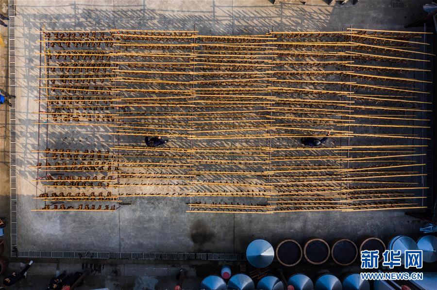 初冬時節(jié),浙江省紹興市柯橋區(qū)安昌古鎮(zhèn)開啟了傳統(tǒng)臘味制作、上市的季節(jié)。當?shù)匕傩沼脗鹘y(tǒng)醬油、黃酒、香料等手工腌制臘腸、醬鴨、魚干、醬鵪鶉、醬排骨等紹興特色醬貨,在冬季的陽光下進行晾曬,滿街飄香的臘味也成了這座江南古鎮(zhèn)的獨特風景。安昌古鎮(zhèn)是浙江省歷史文化名鎮(zhèn),有著一千多年歷史,比較完善地保存了古吳越地區(qū)沿襲千百年來的民俗風情。每年大雪節(jié)氣前后,安昌當?shù)匕傩瞻凑諅鹘y(tǒng)習俗挑選晴朗好天氣制作、晾曬傳統(tǒng)醬貨,各類醬貨顏色黑紅油亮,咸鮮適口,是當?shù)囟镜奶厣珎鹘y(tǒng)美食。新華社記者徐昱攝