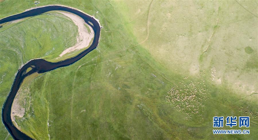 8月29日無人機拍攝的內(nèi)蒙古呼倫貝爾市陳巴爾虎旗境內(nèi)的莫日格勒河與羊群。新華社記者李京攝