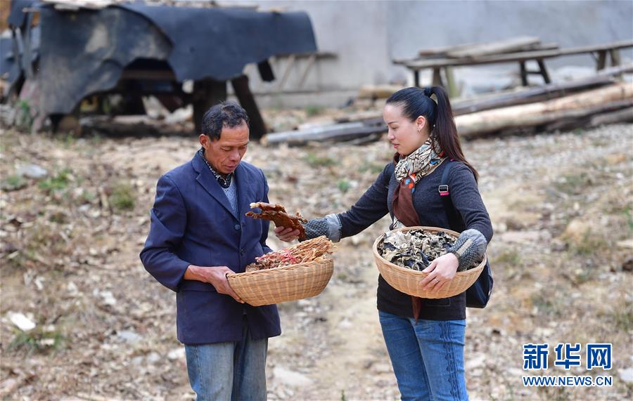 在鹿寨縣拉溝鄉(xiāng)木龍村,李柳萍(右)到五保戶(hù)李建文家收購(gòu)木耳、干筍等(12月14日攝)。新華社記者黃孝邦攝