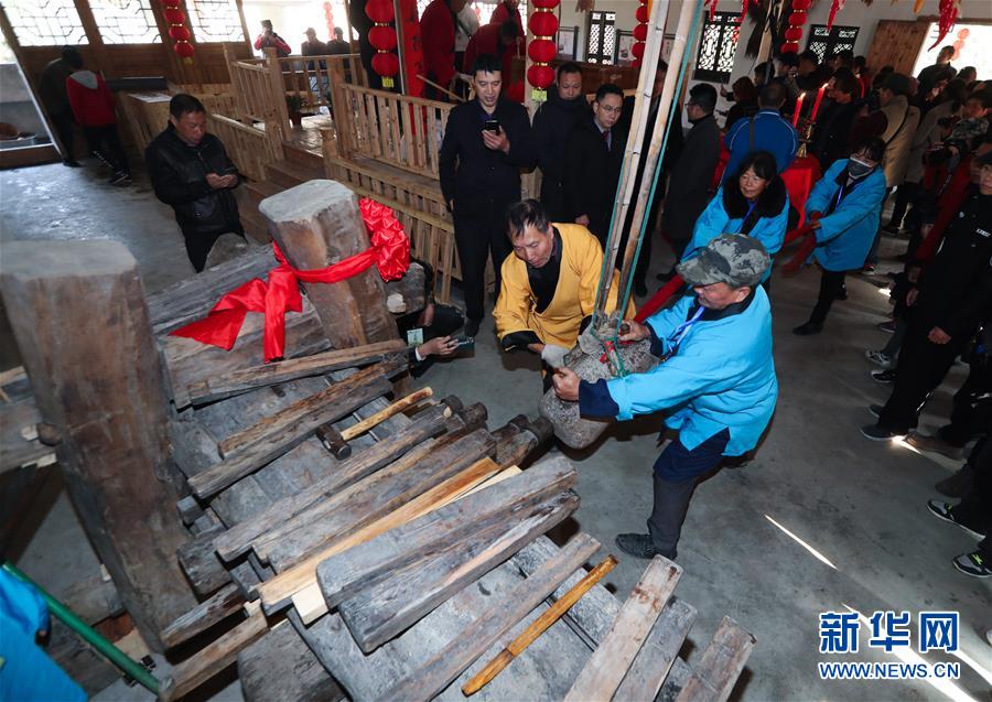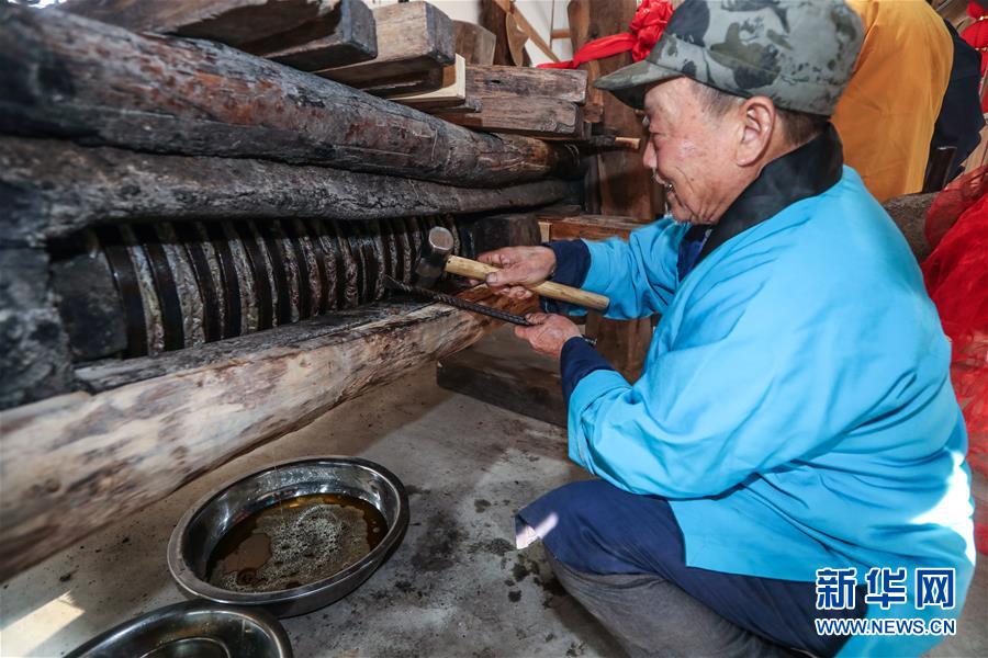 12月15日,工作人員在老油坊內(nèi)通過撞擊的方式將不同尺寸的木楔插入木龍,進而榨出茶餅中的茶油。 新華社記者 徐昱 攝