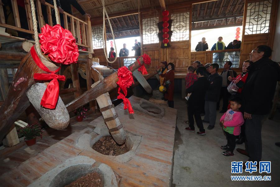 12月15日,游客在老油坊中體驗以傳統(tǒng)方式給茶籽脫殼。 新華社記者 徐昱 攝