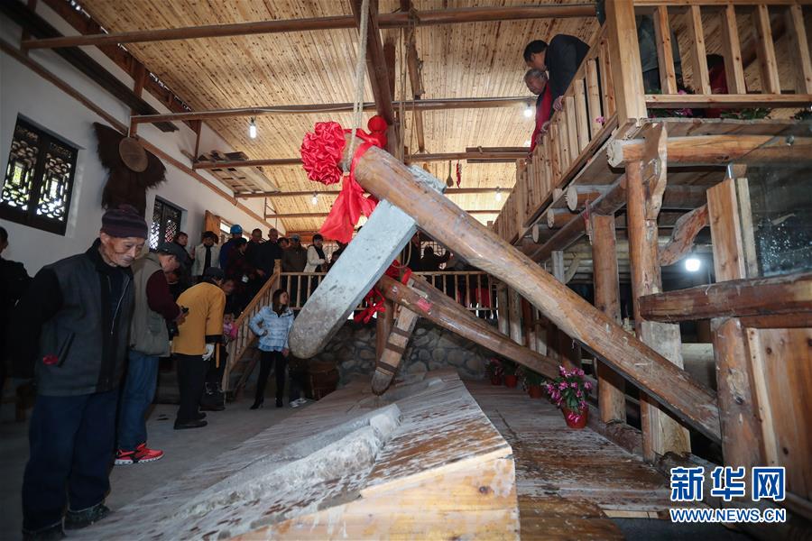 12月15日,油坊中的水車帶動大木棰砸碎茶籽。 新華社記者 徐昱 攝