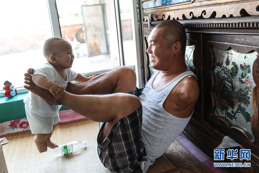 8月8日,王剛與兒子“肉肉”在家中玩耍。33歲的王剛來自遼寧省鐵嶺市昌圖縣兩家子鎮(zhèn)河西村。作為父親,王剛雖然沒有堅實的臂膀去擁抱自己的孩子,但他一直努力用自己的方式呵護(hù)照顧家人?!盁o臂爸爸”的父愛給很多人帶來了力量和鼓舞,被人親切地稱為“最強(qiáng)爸爸”。新華社記者潘昱龍攝