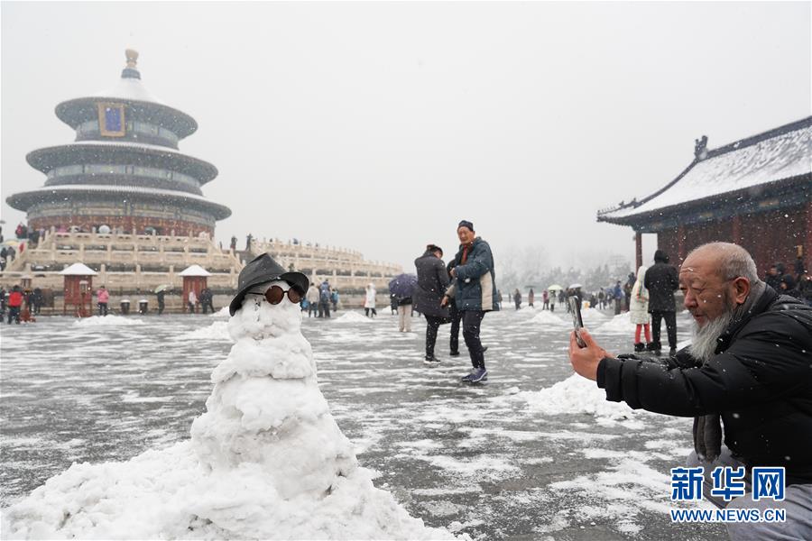 12月16日,在北京天壇公園,一名游客拍攝雪人。 當(dāng)日,北京迎來(lái)降雪天氣。 新華社記者 鞠煥宗 攝