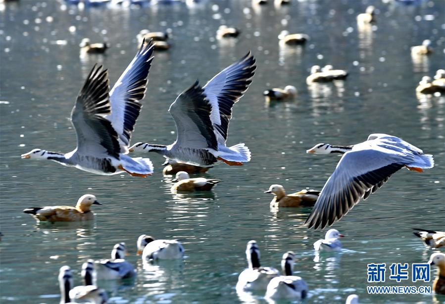 11月21日,候鳥在拉薩龍王潭公園水中嬉戲。時下,斑頭雁、紅嘴鷗等不少候鳥陸續(xù)飛抵拉薩河谷、雅魯藏布江沿岸等地避寒。新華社記者普布扎西攝