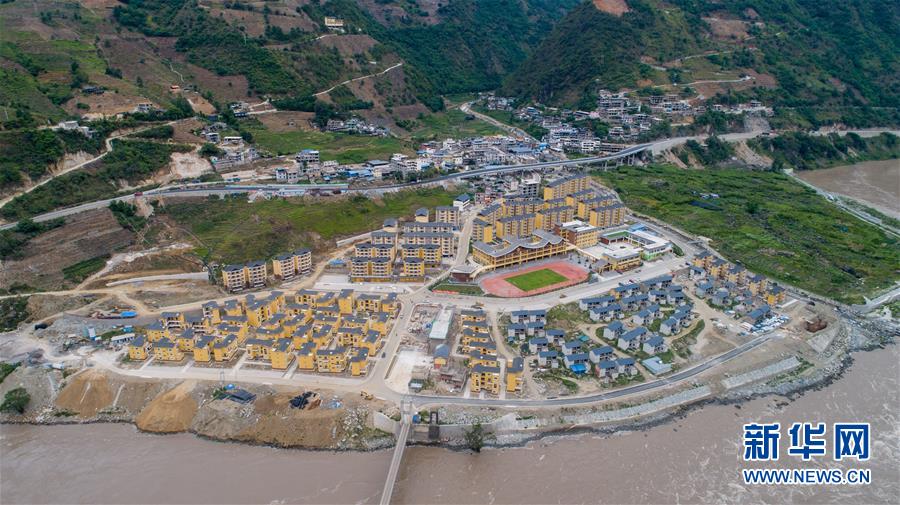 建于怒江邊的大興地鎮(zhèn)維拉壩“珠海小區(qū)”內(nèi)的學(xué)校和住房已初現(xiàn)規(guī)模(6月24日無人機(jī)拍攝)。新華社記者胡超攝