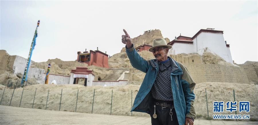 達(dá)瓦次仁和他曾經(jīng)居住的、位于古格遺址前的家(7月30日攝)。新華社記者晉美多吉攝