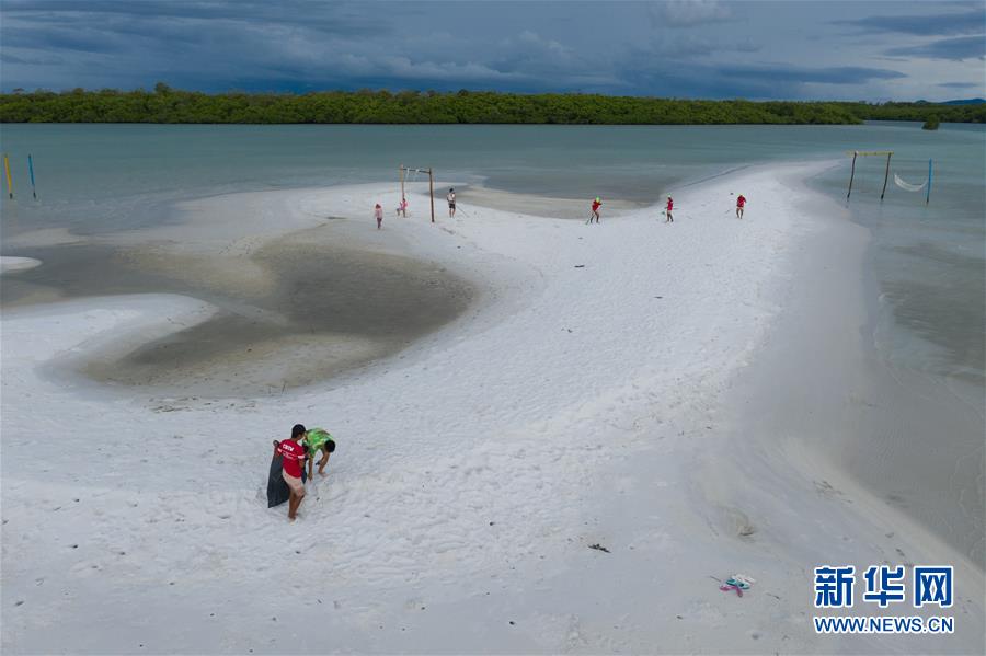 12月8日,在印度尼西亞邦加勿里洞省,李嘉文(左下)帶領(lǐng)工人在李王島的白色海床清理垃圾(無人機拍攝)。 新華社記者杜宇攝