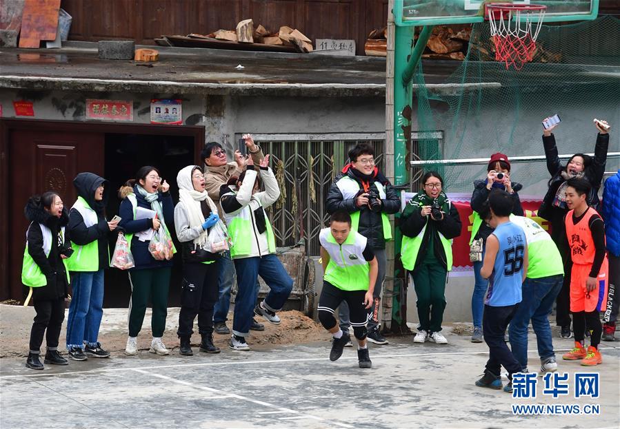 12月26日,澳門青年藝能志愿工作會(huì)的義教老師李嘉堯(右三)在籃球比賽中投籃。 新華社記者 黃孝邦 攝