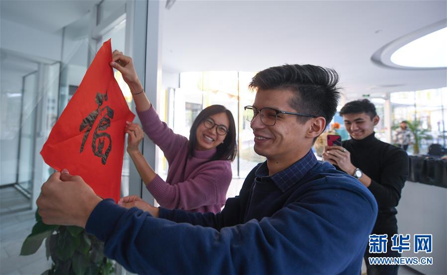 12月27日,來自俄羅斯的留學(xué)生阿布(中)在瓜山新苑社區(qū)活動中心與中國青年一起貼福字。新華社記者 徐昱 攝