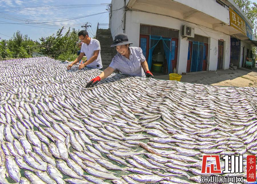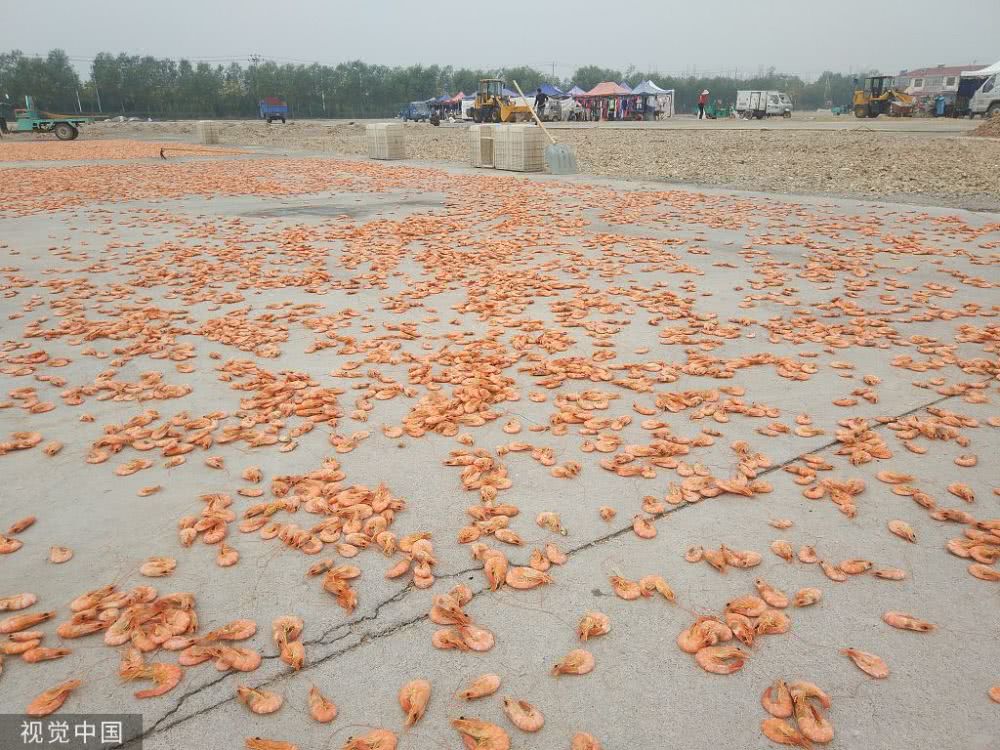 渤海灣畔海產豐收,成群魚蝦分揀后當街晾曬,場面賽曬糧食