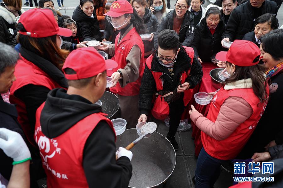1月2日,志愿者在閬中古城貢院廣場(chǎng)給大家發(fā)放臘八粥。 當(dāng)日是農(nóng)歷臘月初八臘八節(jié),四川閬中古城舉行“萬人同品臘八粥”活動(dòng),當(dāng)?shù)鼐用窈捅姸嘤慰驮谪曉簭V場(chǎng)免費(fèi)享用臘八粥。 新華社記者 江宏景 攝