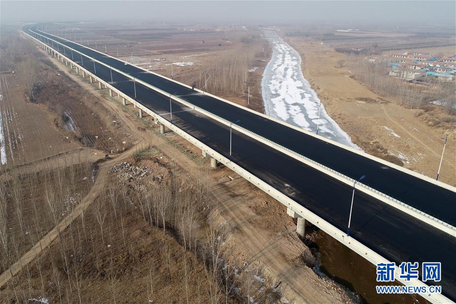 這是1月3日拍攝的北京大興國(guó)際機(jī)場(chǎng)北線高速公路廊坊段龍河特大橋(無(wú)人機(jī)照片)。新華社記者牟宇攝