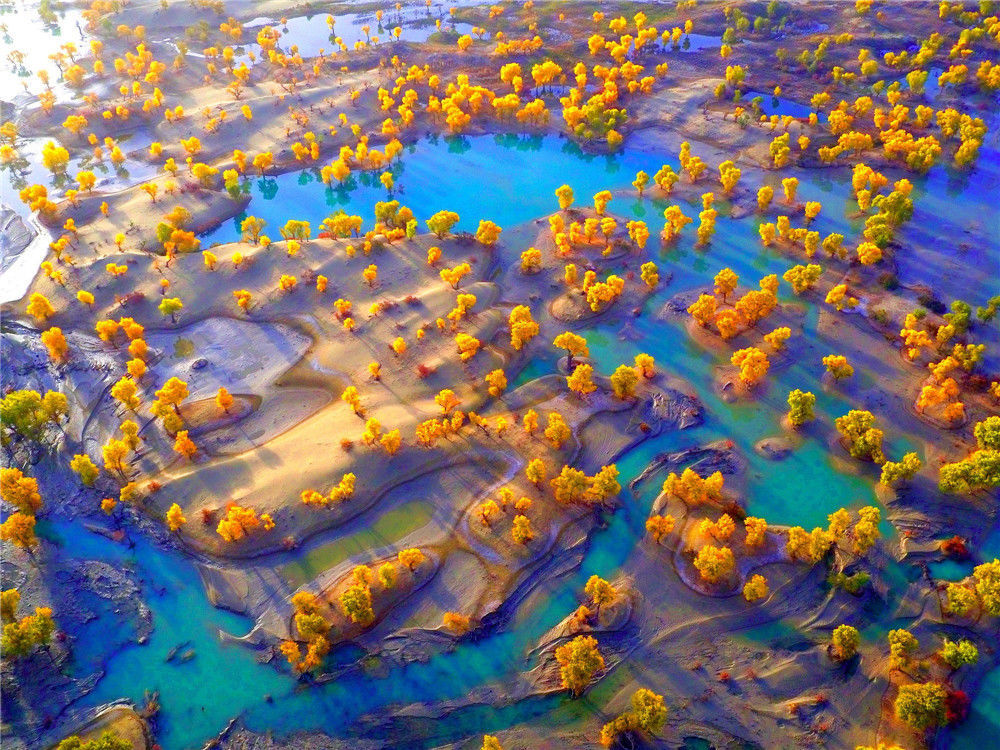 2016年11月2日,航拍的新疆塔里木河尉犁縣段胡楊林。胡熱/視覺中國