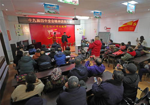 2019年11月26日,遼寧省十九屆四中全會(huì)精神曲藝宣講小分隊(duì)成員在沈陽市南九社區(qū)活動(dòng)室表演節(jié)目《大和小》。新華社記者楊青攝